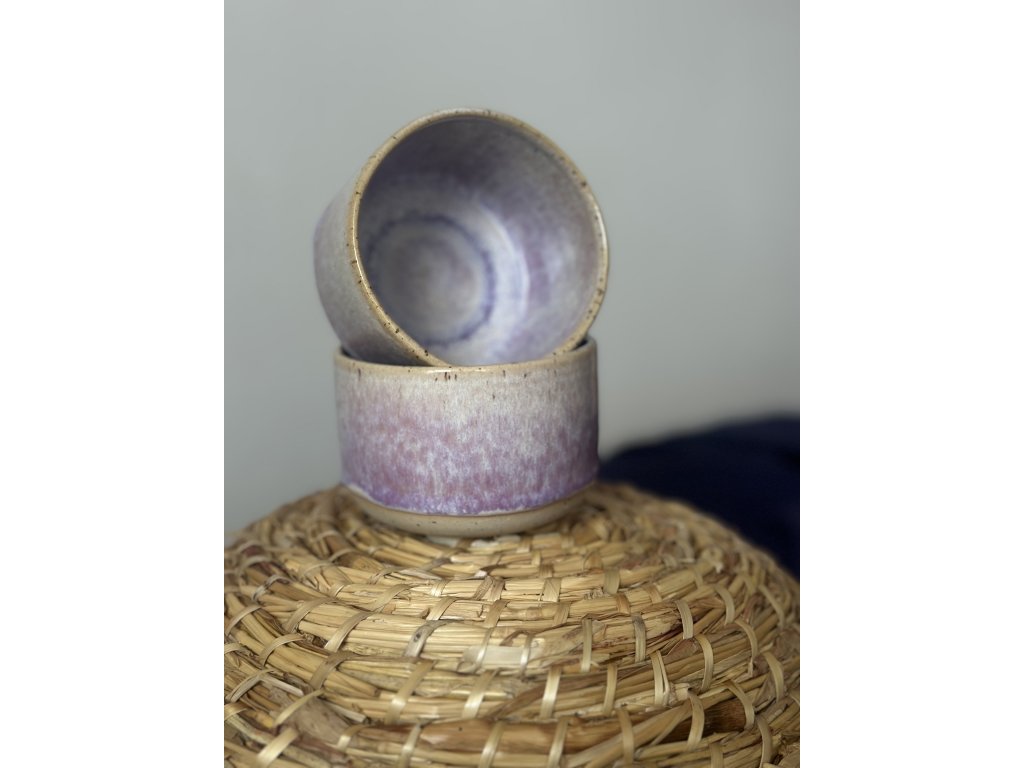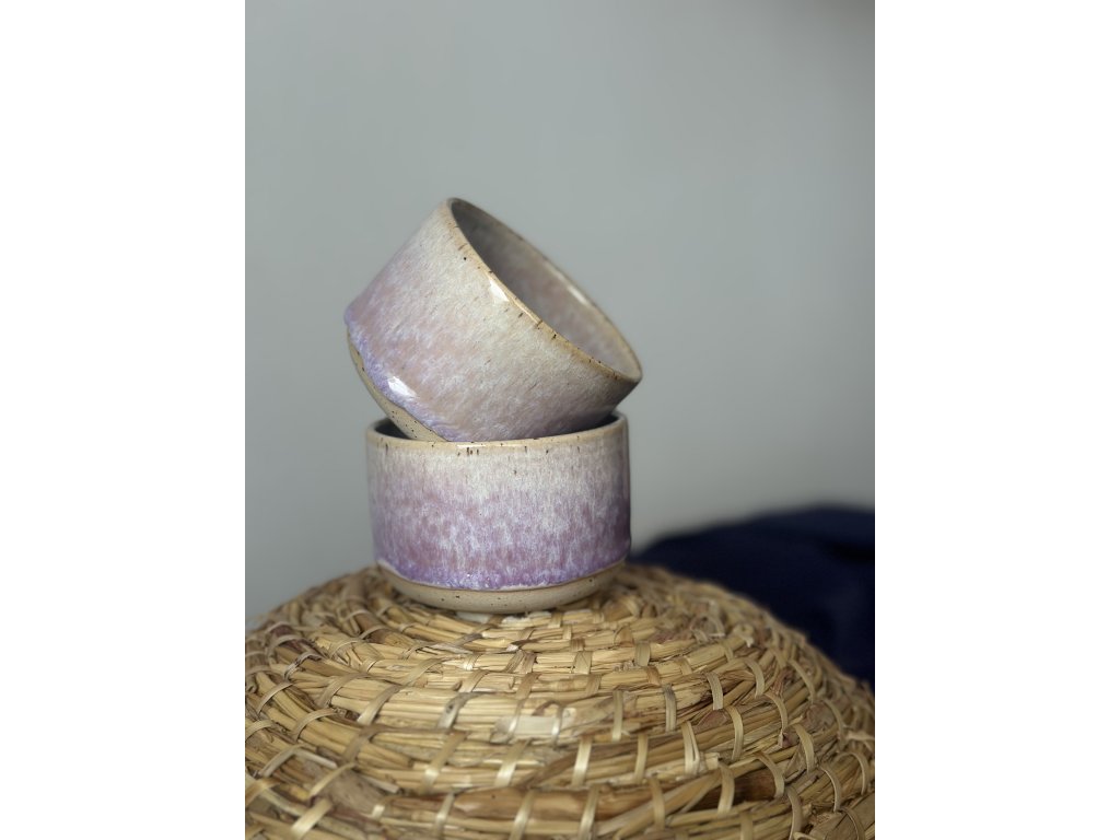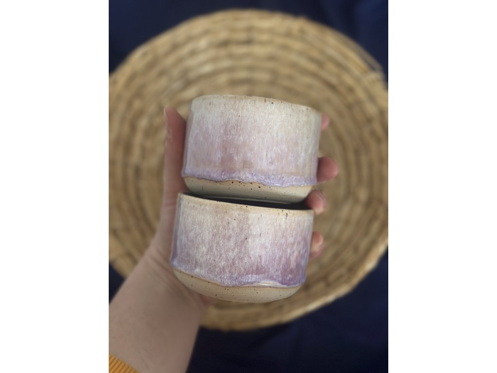 Keramický hrneček bez ouška ze světlé tečkované hlíny a s růžovou glazurou.