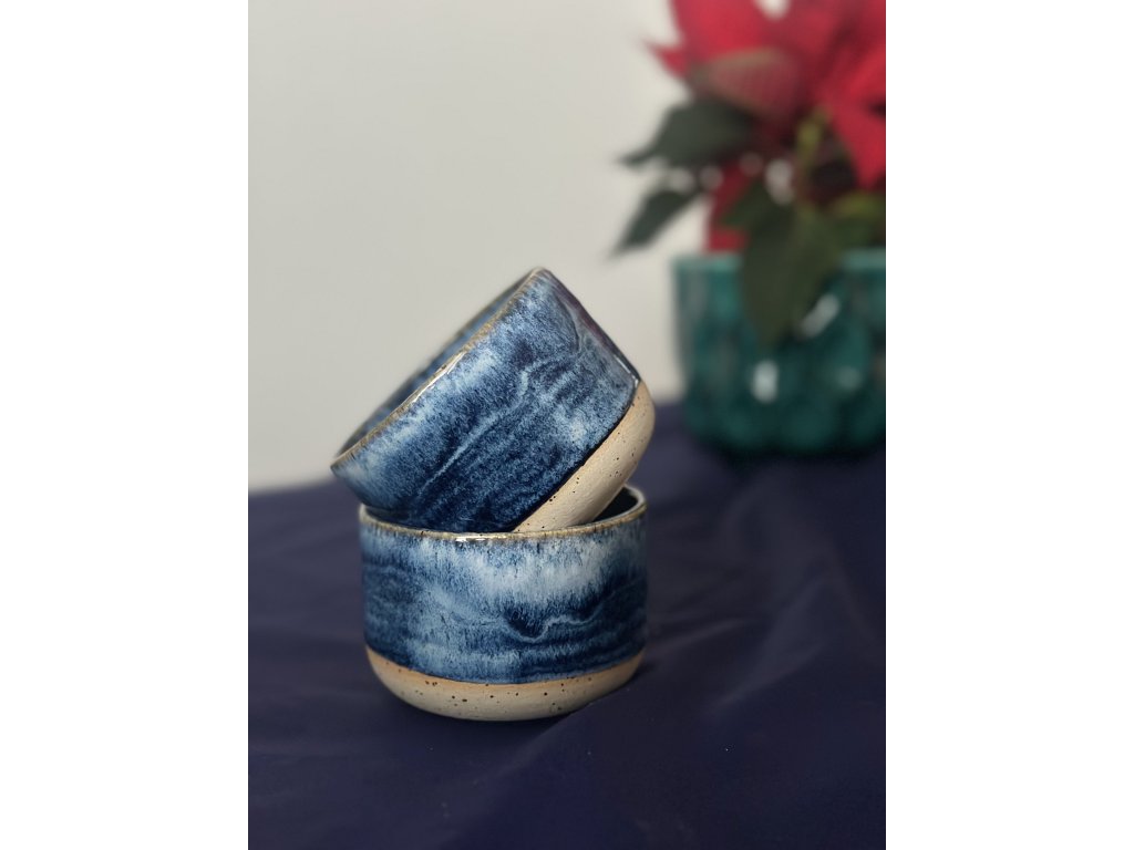 Keramický kalíšek bez ouška ze světlé tečkované hlíny a s tmavě modrou žíhanou glazurou.